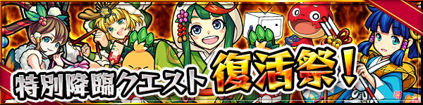The latest tweets from @raika_tg降臨クエスト情報 14年12月29日(月) 000~0 「大暴れ!上様の曲者大掃除」(★5 徳川吉宗) 800~1000 「世界を焼き尽くす焔の巨人」(★5 スルト) 1000~10 「闇狼!ビゼラーの牢獄」(★5 ビゼラー) 10~1400 「水色革命!ケーキは如何?」(★5 マリーアントワネット) 「年末年始特別降臨クエスト復活祭」開催! 期間中、過去に期間限定で登場した年末年始の特別降臨クエストが再び出現します! 対象の特別降臨クエスト ・大暴れ!上様の曲者大掃除( ★5 徳川吉宗 ) ・初夢ストライクでごザル!( ★5 丙申デイジー )